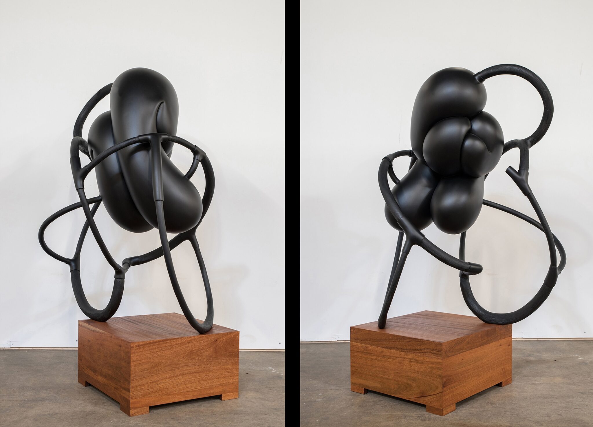 Hand-cast industrial grade organopolymer, enamel paint & steel on handcrafted Honduran Mahogany, 62″h x 40″w x 30″d, 2020.