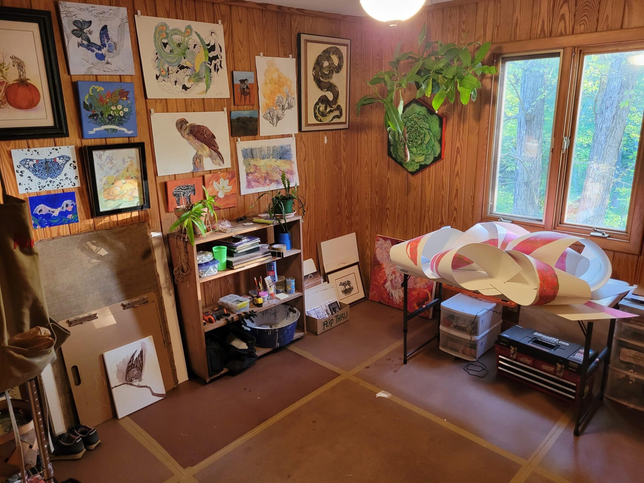 how my studio looks aftet I’ve just finished a project. The wall space is limited so I usually have to utilize tables and stools to work on things before they are installed.
