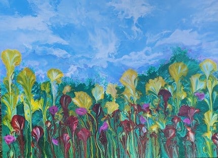 Although primarily self-taught, Diane has taken art lessons throughout her journey, continually learning and growing as an artist. Fluid art has been a long-standing passion—she is captivated by the interaction of color in acrylics and has developed a unique style through ongoing experimentation. Her work often blends abstract forms with the natural world, reflecting her love of nature and floral beauty.