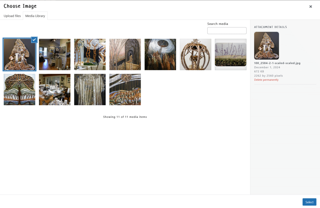Once you have uploaded an image make sure you have selected the image you want to attach to this artwork. Then click the blue select button at the bottom right of the screen.