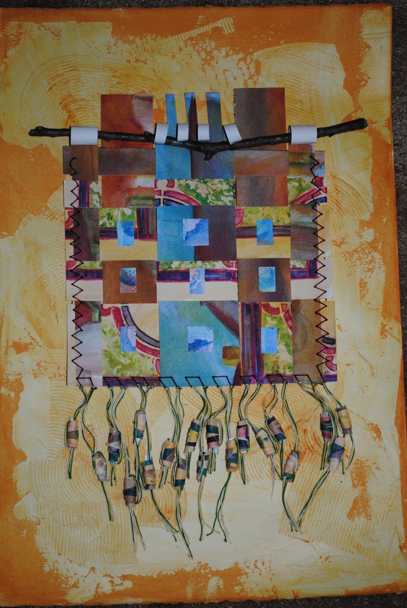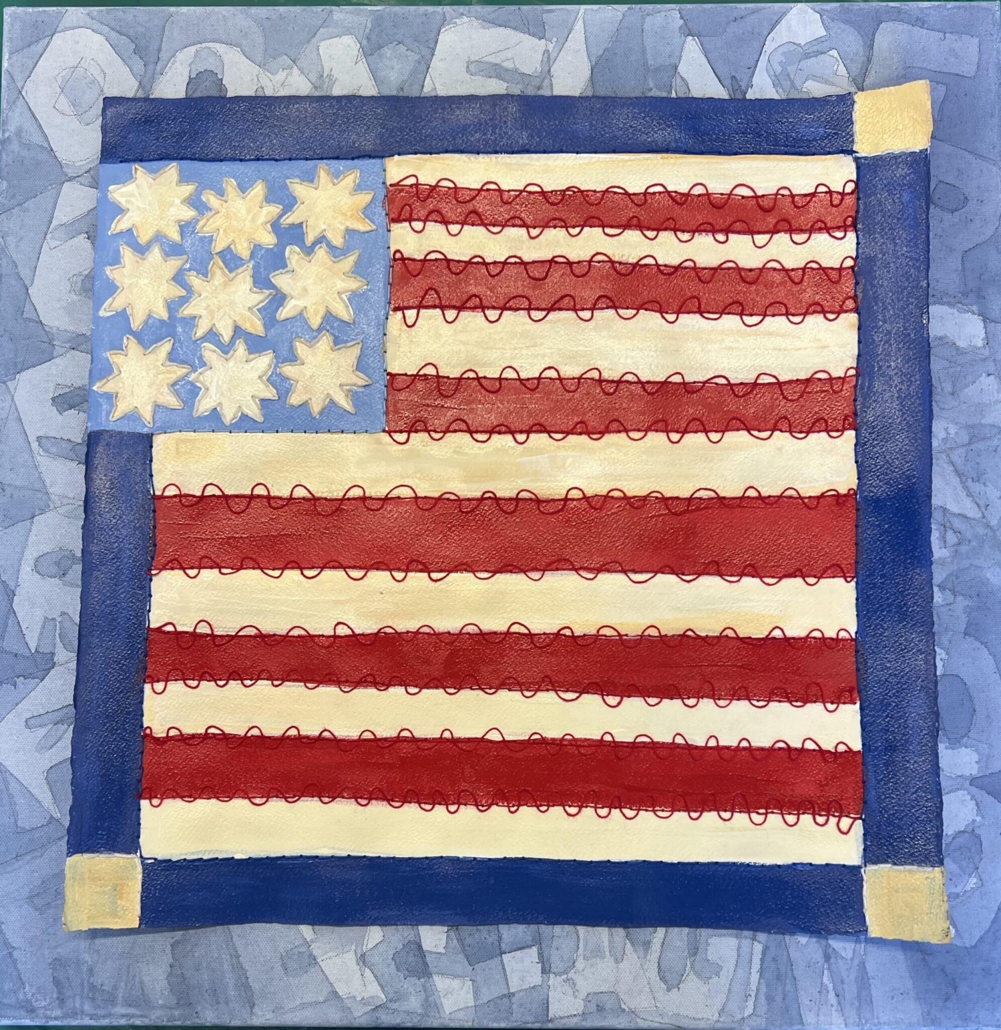 Watercolor patchwork is my unique process where I have built the background surface of my artwork through the layering colors and incorporating textural materials to enhance the surface quality. This process involves sewing through the paper, adding buttons and opening areas to reveal hidden images underneath. Using the traditional of quilting, I have coined the term “watercolor patchwork” to celebrate the legacy of the quilts and my love for watercolor media. This gives my work a grid like appearance.