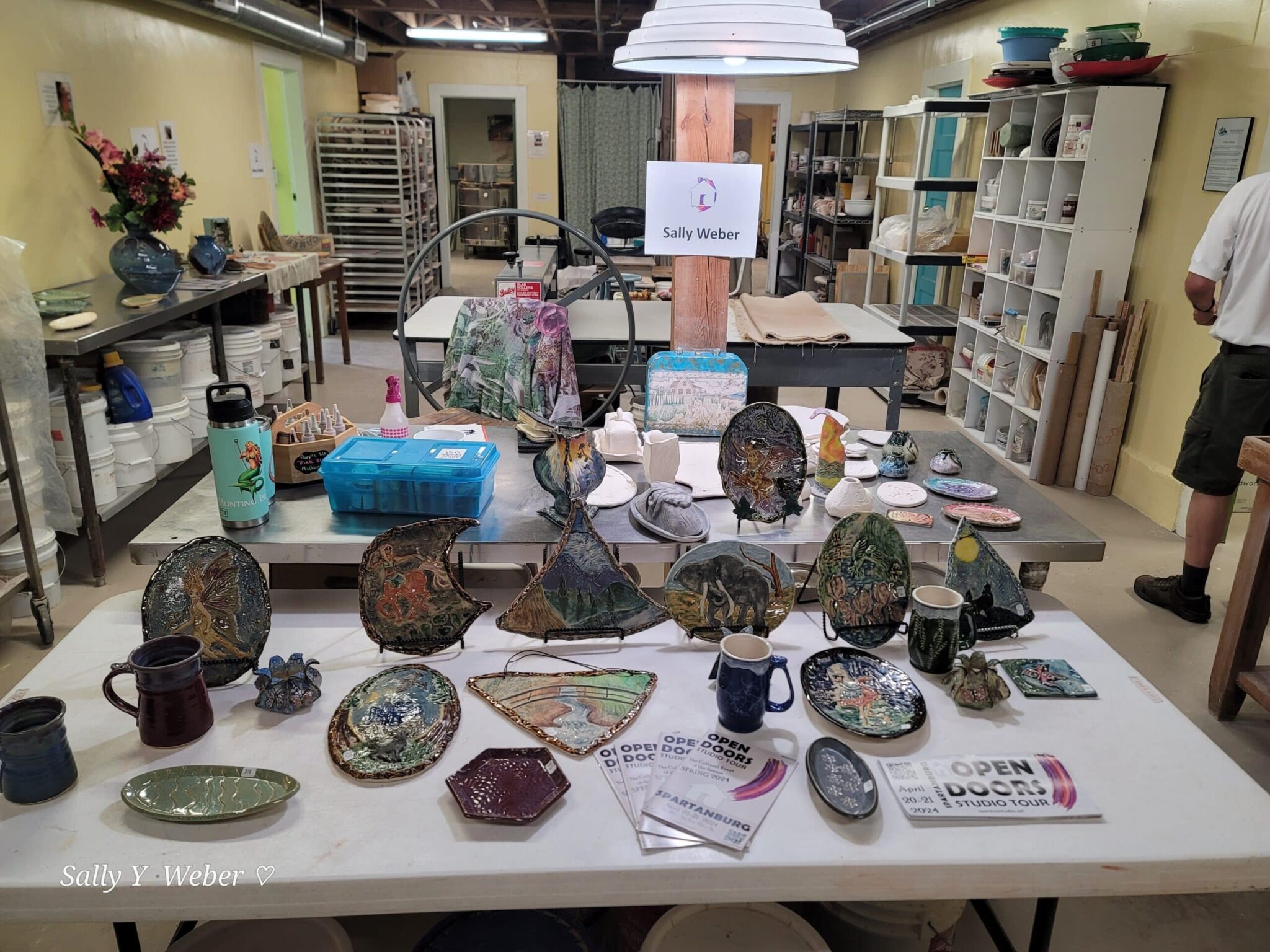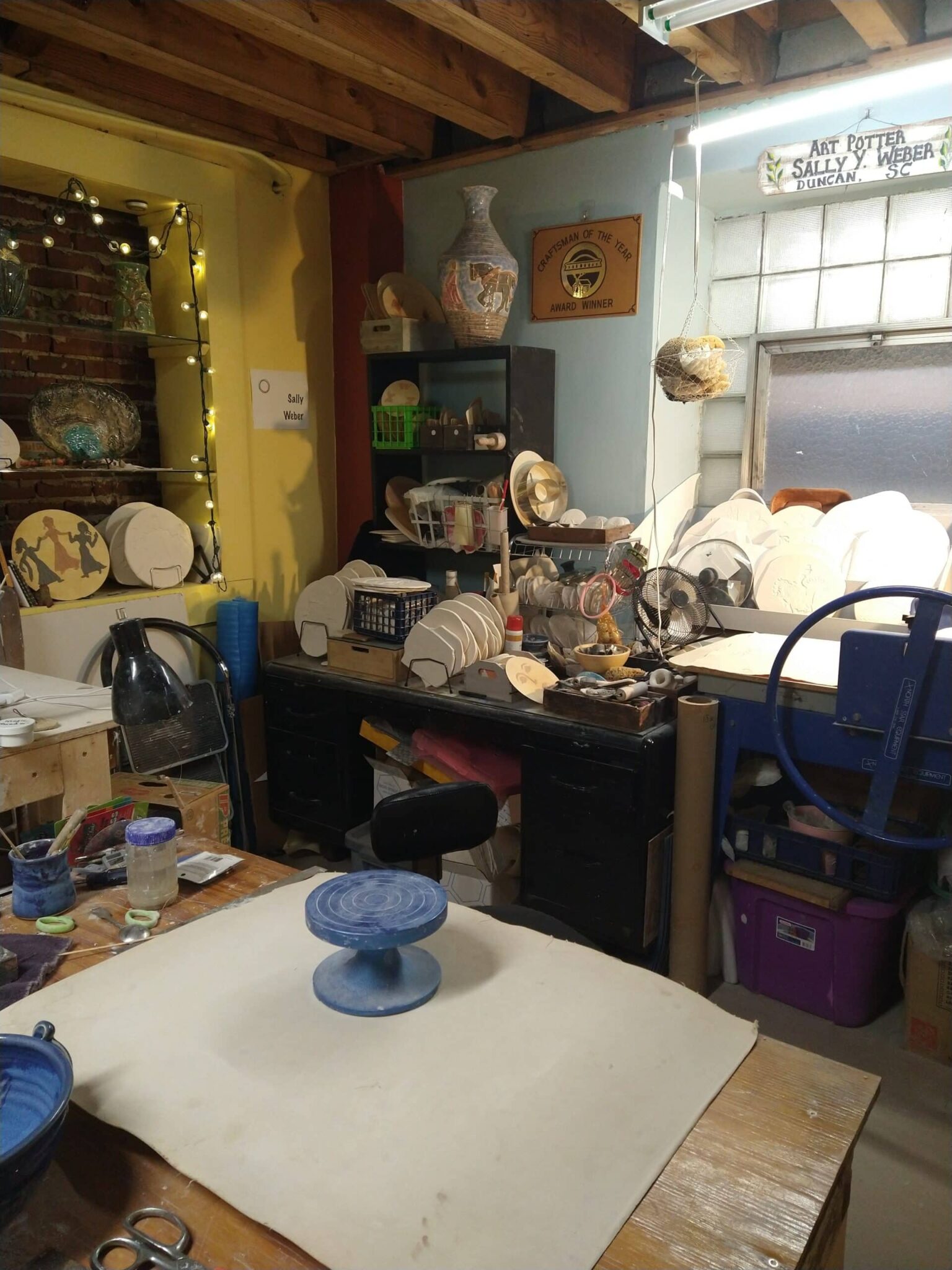 Jim and I have been sharing a studio for over 30 years. He on his pottery wheel and me using table and slab roller.
